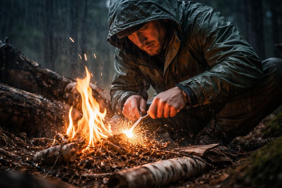 Когда нет спичек и зажигалки, на помощь приходят альтернативные методы. Один из самых надёжных — огниво. Даже под дождём искры от качественного ферроцериевого стержня способны воспламенить подготовленную растопку. Главное — защитить очаг от прямого попадания воды и действовать быстро.
